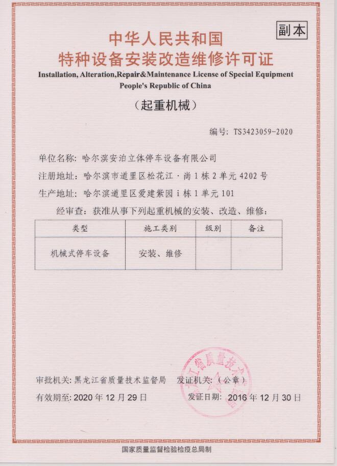 近日,公司接到黑龍江省質(zhì)量技術(shù)監(jiān)督局頒發(fā)的《中華人民共和國特種設(shè)備安裝維修許可證(起重機械)》,公司獲準(zhǔn)從事機械式停車的安裝維修。