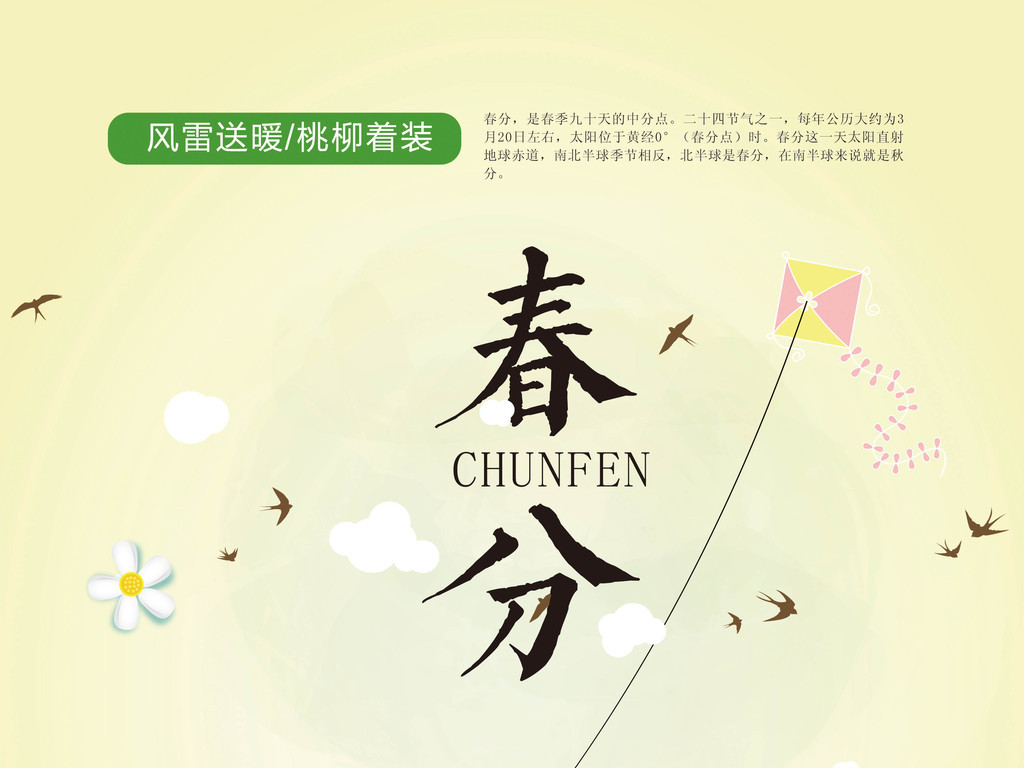 中國古代將春分分為三候:“一候元鳥至;二候雷乃發聲;三候始電。”便是說春分日后,燕子便從南方飛來了,下雨時天空便要打雷并發出閃電。春分在中國古歷中的記載為:“春分前三日,太陽入赤道內”。