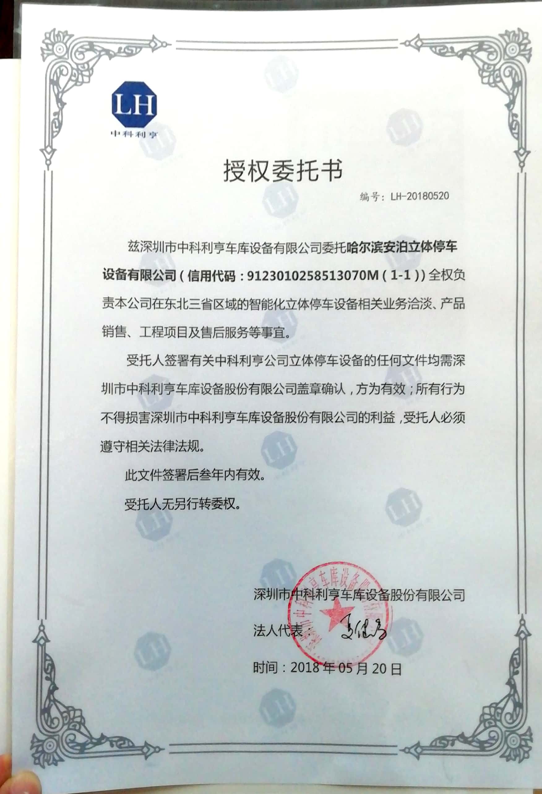 安泊停車于2018年拿到深圳市中科利亨車庫設備股份有限公司關于東三省的授權代理。