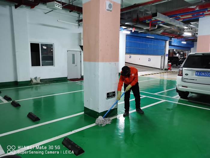屑,無積水、無污跡和雜物;每天地面淸掃一次,用水拖擦地面一次,保證地庫衛生標準;定期清