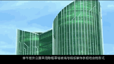 車庫整體外形呈元寶形,外立面采用隱框與穿孔鋁板相結(jié)合的幕墻形式,外觀大氣。