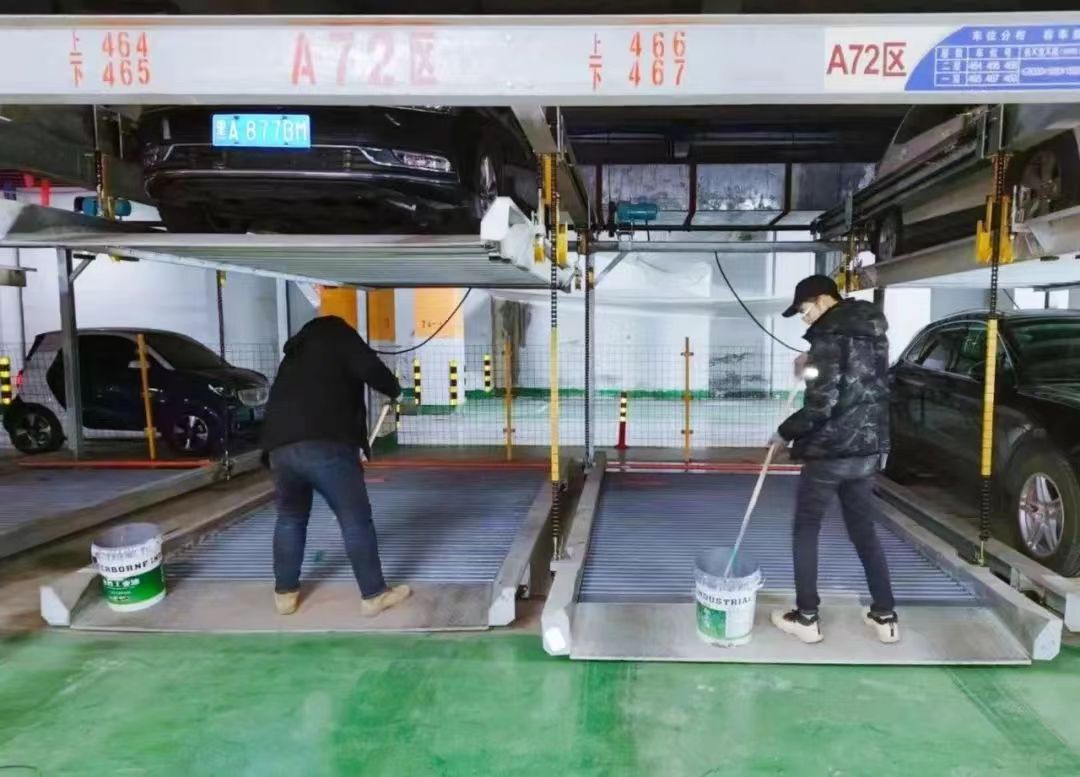 由于車板長時間處于地下陰暗受潮的環境以及北方冬天融雪劑的影響,導致車板鋅層腐蝕、生銹、起皮的病害現象、為了提升廣大業主的使用體驗及設備的使用壽命,我公司工程部按工作計劃有序地對其1000余個車位進行表面及細部的打磨除銹、防腐處理,然后對整個車板進行重新涂刷油漆,確保車板表面光亮、平整,增加了車板的美觀性。